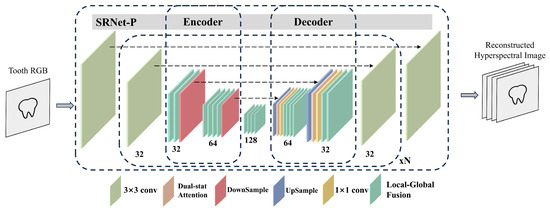 According to Equation (5), SRNet-P is tasked with reconstructing the hyperspectral image from the RGB image of the tooth sample. SRNet-P adopts a U-Net-like network architecture. Rather than performing upsampling via simple interpolation, the U-Net structure progressively upsamples the RGB image to the target spectral resolution and maps these features into a specific representation, enabling the generation of I(λ)S(x, y, λ) based on the unique spectral characteristics of the scene. To further mitigate the impact of noise and improve reconstruction accuracy, attention modules are incorporated into the U-Net-like structure within SRNet-P, allowing the network to extract salient spectral features and integrate them with highly correlated contextual information.