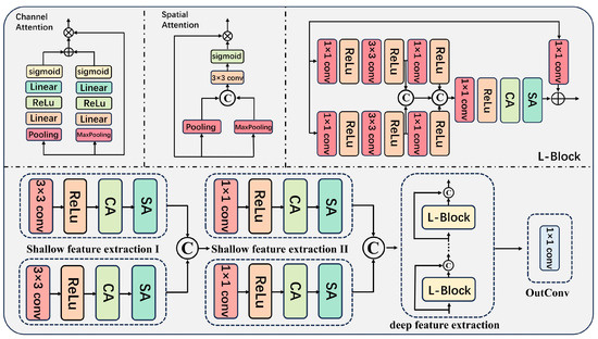 The input to the network is a feature tensor Xin ∈ RB×C×H×W, where B, C, H, and W represent batch size, number of channels, height, and width, respectively. Initially, shallow feature extraction is performed through two parallel convolutional paths, each consisting of a 3 × 3 convolution followed by ReLU activation, channel attention (CA), and spatial attention (SA) modules, producing feature maps F1 and F2: