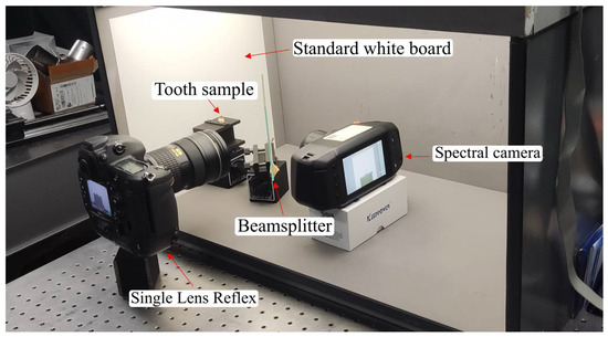 To maintain uniformity in the experimental input data pairs and enhance the robustness of the spectral reconstruction framework, the optical system was designed and assembled in accordance with the following specifications. Instead of utilizing the pre-existing simulated dataset, a binocular imaging system was designed and implemented to acquire a real-world dataset. A beam splitter was employed to divide the incident light into two separate beams, enabling the simultaneous acquisition of ground-truth and corresponding images sharing an identical field of view. As depicted in Figure 4, the light reflected from the object is incident on the semi-transparent, semi-reflective beam splitter at a 45-degree angle. This arrangement guarantees that the reflected image is aligned perpendicular to the optical axis of the DSLR camera (Nikon Corporation, Tokyo, Japan), while the transmitted image is oriented perpendicular to the optical axis of the spectral camera lens. Both devices were calibrated and securely mounted to ensure a stable and consistent field of view throughout data acquisition. To aid readers in comprehending the essential details of the equipment and materials used in the experimental setup, the key information has been consolidated into a table. For further details, please refer to Appendix C.