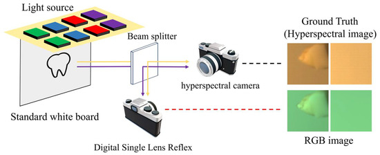 Schematic representation of the experimental imaging setup. The scene light is divided into two paths after a beam splitter. The yellow lines indicate the light-source pathways, while the purple lines represent the optical paths associated with the teeth. After passing through the beam splitter, the light is directed into both the hyperspectral and single-lens reflex cameras for imaging, thereby simultaneously capturing the RGB and hyperspectral images required for the dataset. The red and black dotted lines in the figure indicate the images acquired by the respective cameras.