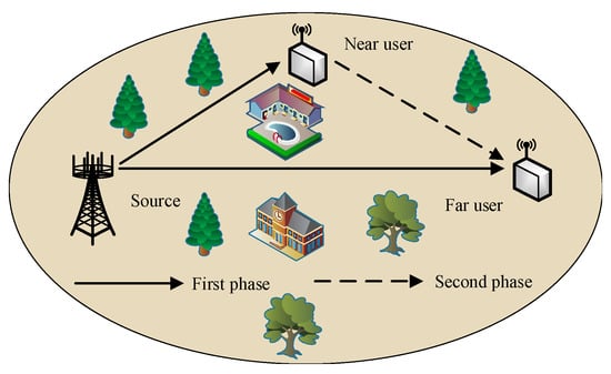 A multi-antenna cooperative NOMA network is considered, as illustrated in Figure 1. The network consists of a source (S) equipped with N antennas, a near user (), and a far user (), each employing a single antenna. This configuration is particularly relevant in practical applications, such as IoT scenarios, where multi-antenna access points communicate with two sensors, each constrained to a single antenna due to cost and size limitations [29]. To achieve low latency, the information transmitted from S to and is formatted into short-packet. As a result, the end-to-end delay is significantly shorter than the channel coherence time. Therefore, the channel coefficients are modeled as constant within each transmission block and independently varying across blocks [39]. Due to the half-duplex limitation of each node, each transmission block is divided into two phases. In the first phase, S broadcasts a superposed signal to and using the NOMA scheme. In the second phase, acts as a relay, forwarding the signal intended for .