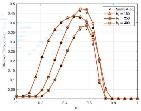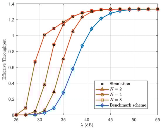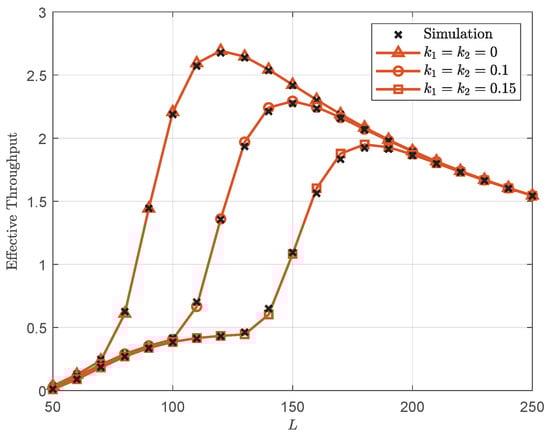 Effective throughput versus with dB, , and .