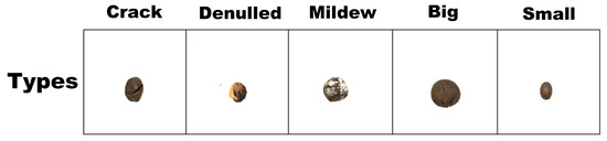 All prepared tea seeds were divided into five categories: cracked seeds, moldy seeds, bare seeds, large improved seeds, and small improved seeds. Representative images of each seed type are shown in Figure 1.
