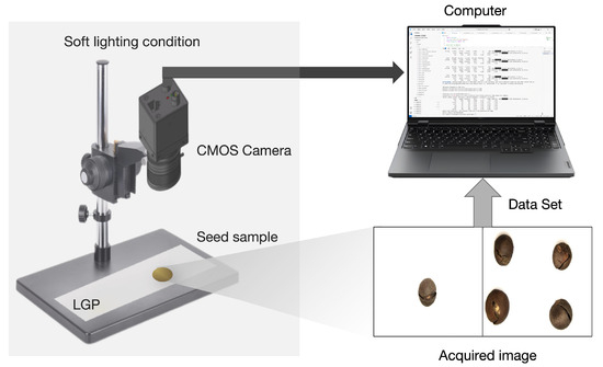 Seeds were placed centrally, and the camera was fixed at an optimal shooting distance of approximately 12–15 cm. Key exposure parameters were kept constant to ensure consistency. The setup allowed repositioning of seeds to capture images from multiple orientations. It was also designed to allow three-way adjustments in height, brightness, and angle to comprehensively record the surface characteristics of seeds, as illustrated in Figure 2.