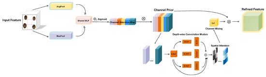 For the input feature map F, average pooling and max pooling are first applied, aggregating spatial information from two independent perspectives to generate two distinct spatial descriptors. This dual-pooling strategy is based on the assumption that defect-relevant features in tea seeds exhibit distinguishable patterns in either average or maximum intensity distributions. Moldy regions, for example, show consistent color shifts captured by average pooling, while cracks or bare spots display local intensity peaks captured by max pooling, avoiding over-reliance on a single statistical measure. These descriptors are then passed through a shared multi-layer perceptron (MLP), and the result generates the channel attention map CA(F), which accurately reflects the true feature distribution and enhances the network’s segmentation performance. The channel prior is obtained by performing element-wise multiplication between the input feature map F and the channel attention map CA(F), yielding an effectively weighted channel prior. Multi-scale spatial information is then extracted by feeding this result into the depth-separable convolution module with kernel sizes 5 × 5, 1 × 7, 1 × 11, 1 × 21, 7 × 1, 11 × 1, 21 × 1—vital for detecting defects of varying sizes from tiny spots to large cracks. After feature fusion, a 1 × 1 convolution is applied for channel fusion, generating the spatial attention map SA(F). Depthwise convolutions here apply each kernel to individual channels, reducing computation compared with standard convolutions in CBAM. The calculation of channel attention and spatial attention can be expressed as follows: