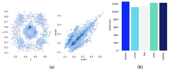 In addition to the evaluation metrics, the distribution characteristics of the dataset play a crucial role in validating the model’s generalization ability. The distribution of these images is illustrated in Figure 7, which provides insights into the data composition and category balance of the constructed tea seed defect dataset.