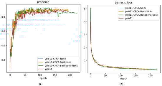 The performance of different models in the comparative experiment of CPCA module: (a) The precision curve; (b) The classification loss on the train set.