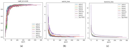 The performance of different models in the comparative experiment: (a) The mean average precision of the model within the IoU threshold range from 0.5 to 0.95; (b) the classification loss on the validation set. (c) The classification loss on the train set.