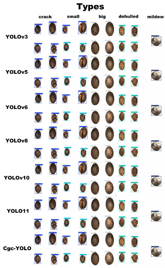 Figure 11 presents a comparison of detection results, with confidence scores displayed next to each detection box. The experimental results demonstrate that Cgc-YOLO significantly outperforms other models in detecting surface defects of tea seeds. For moldy seeds, Cgc-YOLO achieves a confidence score of 0.95, compared with 0.89 for the original YOLO11 model, an increase of 0.06. For cracked seeds, the confidence score is 0.95, which is 0.03 higher than the 0.92 score of YOLO11. Overall, Cgc-YOLO shows a clear improvement in detection confidence compared with the original model.