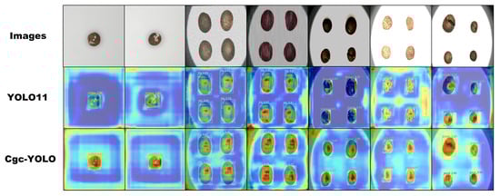 As illustrated in Figure 12, during the detection of surface defects on tea seeds, the heatmaps generated by Cgc-YOLO show more intense and concentrated activation in the defect regions. This pattern directly reflects the model’s functional learning: the CPCA attention mechanism and GhostBlock modules enable it to learn to weight defect-related features more heavily, strengthening the encoding of critical defect characteristics, e.g., edge contours and texture anomalies in intermediate layers. Consequently, the concentrated heatmaps indicate that Cgc-YOLO has effectively learned to associate these regions with defect categories, reducing the risk of misclassifying background noise as defects—a common source of decision errors in less focused models. In contrast, YOLO11 displays lighter activation around defect areas, weaker responses to key features, and higher sensitivity to background noise. This scattered attention reveals limitations in its functional learning: without targeted feature enhancement, it fails to robustly distinguish defect-specific patterns from irrelevant background information, e.g., natural surface variations of tea seeds. The resulting heatmaps suggest that YOLO11 sometimes allocates gradient weight to non-defect regions, leading to decision errors such as missed detections when defect activation is too weak or false positives when background noise triggers undue attention.
