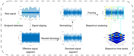 To satisfy the stationarity assumption required for bispectral estimation and to suppress spectral leakage during the Fourier transform process, framing and windowing are applied to the original signal. The framing operation effectively mitigates boundary effects in signal processing and improves the stability of spectral estimation. Moreover, the selection of an appropriate window function helps enhance spectral characteristics and improves time–frequency resolution.