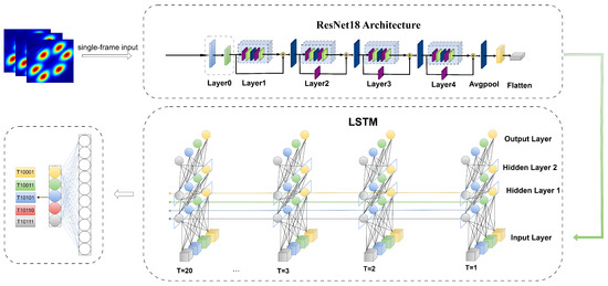 The proposed ResNet18-LSTM network architecture consists of two cascaded components: ResNet18 and LSTM. The changes in input tensor dimensions throughout the model are summarized in Table 1. The rectified linear unit (ReLU) is adopted as the activation function to introduce non-linearity and improve model expressiveness. For pooling operations, the model uses max pooling at the beginning and average pooling at the end to improve feature extraction and overall robustness.