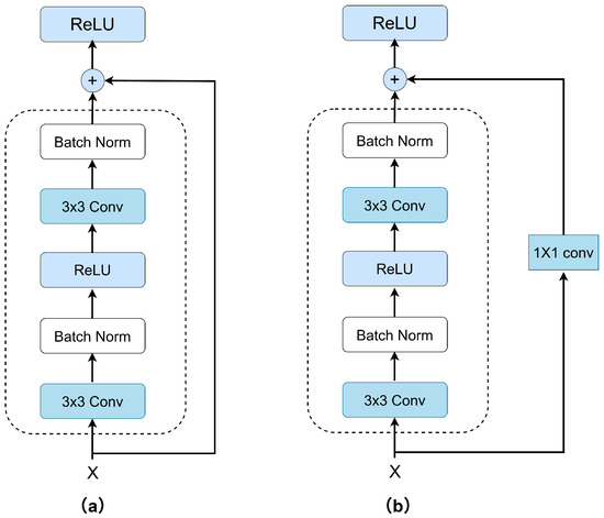 Standard residual block and residual block with downsampling layer [34]. (a) Standard residual block. (b) Residual block with downsampling layer.