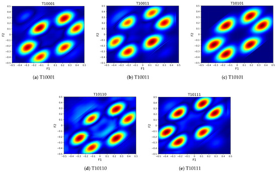 Representative bispectral feature maps of five UAV RF signal categories: (a) T10001, (b) T10011, (c) T10101, (d) T10110, (e) T10111. F1 and F2 represent normalized frequency components in the bispectrum domain, with values ranging from –0.5 to 0.5.
