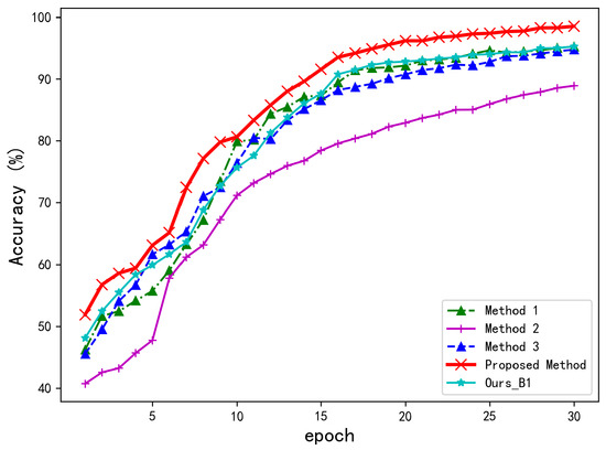 As illustrated in Figure 6, the proposed two-stage bispectrum-based model achieves a recognition accuracy exceeding 98% with identical dataset and training configurations, demonstrating significant superiority over the four comparative methods. The baseline method we reproduced (Ours_B1), which uses 20 consecutive bispectrograms for each input, reaches about 95% accuracy. Among existing methods, the multi-feature fusion model [37] and STFT-based ResNet18 [14] achieve competitive final accuracies of 94%. Conversely, the attention-enhanced non-sequential model [36] demonstrates consistently inferior performance, plateauing below 90% accuracy.