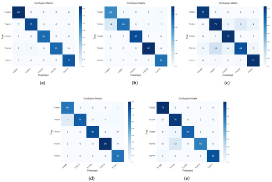 Confusion matrices for five different RF signal identification methods. (a) The proposed method is based on bispectral representations and ResNet18-LSTM. (b) Method from Ref [14] utilizing STFT features and ResNet18. (c) Method from Ref [36] using a single bispectrum frame with an attention module. (d) The feature fusion method from Ref [37] combining STFT and bispectrum inputs for ResNet classification. (e) Baseline method Ours_B1 using 20 consecutive bispectral frames as input to a ResNet18-LSTM model.