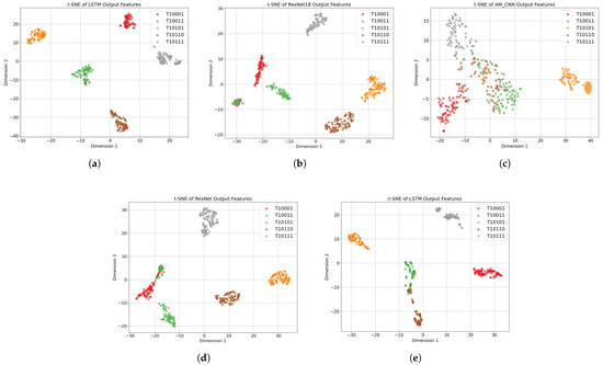 To qualitatively assess the discriminative power of learned feature representations, this study employs t-distributed stochastic neighbor embedding (t-SNE) [38,39,40] to visualize the output features from five RF signal identification models. Specifically, the feature vectors extracted from each input sample by these models are projected into a two-dimensional space. Different UAV signal categories are denoted using distinct colors [41,42] to reveal the distribution patterns in the learned feature space. The resulting t-SNE scatter plots are presented in Figure 8.