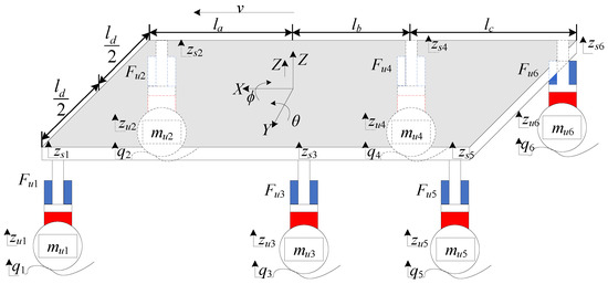The 9-DOF model of the three-axle heavy vehicle with nonlinear electro-hydraulic actuators is shown in Figure 1. Z, , and stand for the heave, pitch, and roll motions of the vehicle body, respectively. M is the sprung mass, and , , are the sprung masses and the unsprung masses of left front, right front, left center, right center, left rear, and right rear, respectively. is the unsprung mass displacement and is the road input to the related wheel. and represent the stiffness and damping coefficients of each tire, respectively. represents the output force of the related electro-hydraulic actuators. represents the unmodeled friction force of the related electro-hydraulic actuators. and denote the mass moment of inertia for the roll and pitch motions, respectively. , , , and are the distances of the suspension to the center of the vehicle body mass. v is the velocity of the vehicle in the x-direction. The dynamic equations of the three-axle heavy vehicle model with electro-hydraulic actuators are established based on the assumption that the pitch and roll angles are small, as follows: