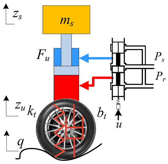 The suspension system of a three-axle heavy-duty vehicle is composed of six independent sets of EHASS. These MEHASS rigidly connected the wheels to the vehicle body. A schematic diagram of the EHASS for an individual wheel, as depicted in Figure 2, consists of an asymmetric hydraulic cylinder and its corresponding electro-hydraulic servo valve.