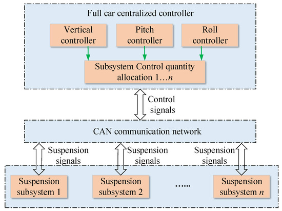 The dynamic model of the multi-axle heavy-duty vehicle and the electro-hydraulic actuators model are presented above. To achieve active suspension control and enhance ride comfort, most existing studies such as those cited in [17,18] employ centralized control schemes. A representative centralized vehicle control architecture is illustrated in Figure 3, which typically includes a centralized attitude controller for the entire vehicle, along with force or position controllers for the actuators within each suspension subsystem. However, as the number of axles increases, the control architecture becomes increasingly complex, and the volume of data transmitted over the CAN bus grows substantially. To address these challenges, this paper proposes a decentralized suspension control approach. The proposed method replaces the complex centralized control structure with a superior local decision-making strategy for each suspension subsystem, thereby reducing the communication load on the CAN bus while maintaining high vehicle ride quality.