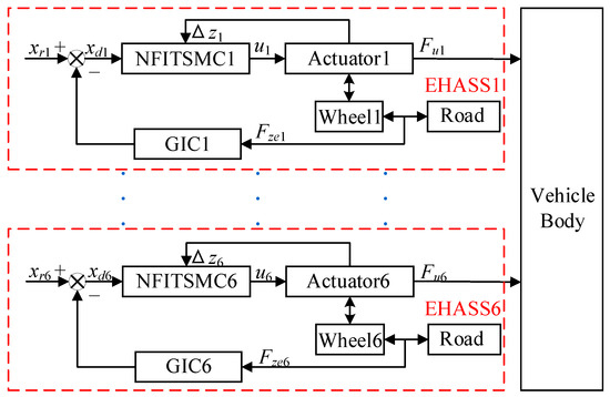 The DCC method is composed of six individual cascade compliance controllers, as shown in Figure 4. Each EHASS is controlled by its own cascade compliance controller, utilizing local information on tire force to effectively manage the dynamic interaction between each wheel and the rough road surface. The cascade controller consists of an outer-loop GIC and an inner-loop position controller. The outer loop generates the vertical compliance trajectory for the EHASS, while the inner loop achieves tracking control through an NFITSMC.