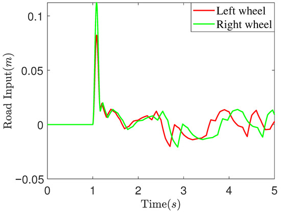 To simulate more realistic road conditions, this study integrates ISO-compliant random pavement with bumpy pavement to generate the pavement inputs illustrated in Figure 5. The vehicle’s driving speed is set to 10 km/h, with the height of the bumpy pavement inputs for the left and right wheels set at 0.08 m and 0.11 m, respectively. In the simulations, the DCC parameters comprise both generalized impedance parameters and position control parameters. Taking the active suspension subsystem for the left front wheel as an example, its generalized impedance parameters are defined as follows: , , , . Position control parameters are assigned as . The parameters of the other suspension subsystems have been slightly adjusted compared to the above example, and the overall difference is not significant.
