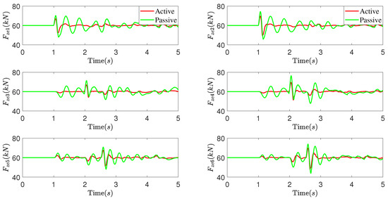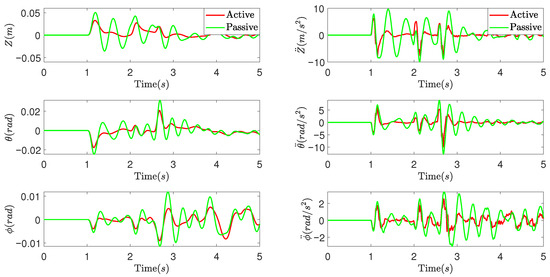The vehicle parameters and electro-hydraulic servo system parameters employed in the simulation are presented in Table 1. The stiffness coefficients and damping coefficients of the passive suspension are denoted by and , respectively, for comparison purposes.