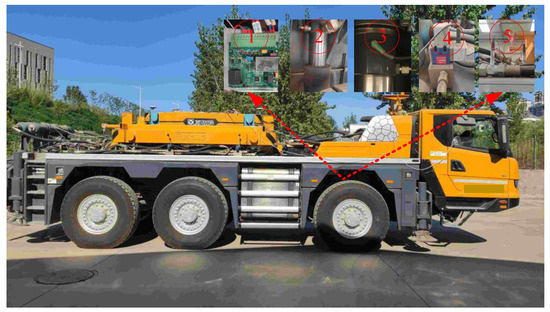 The three-axle heavy vehicle prototype: The electro-hydraulic servo system corresponding to the right front wheel: (1) shows the servo controller, (2) shows the hydraulic actuator, (3) illustrates the displacement sensor, (4) shows the servo valve, and (5) shows the oil pressure sensors.