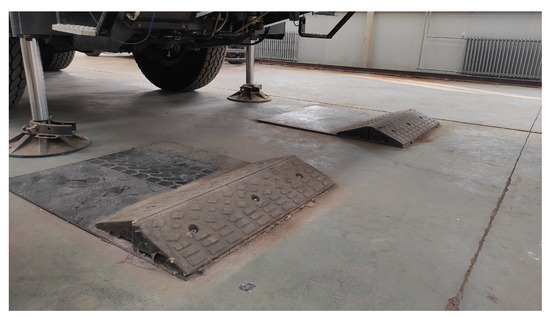 Case study on convex road: Convex triangular obstacles, as depicted in Figure 10, were chosen for this experiment. The obstacle had a height of 0.1 m, a length of 1.0 m, and a width of 0.5 m. They were positioned adjacent to each other on a relatively level road surface, considering the distance between the wheels on both sides of the experimental vehicle. This arrangement ensures that the wheels on both sides of the vehicle can simultaneously traverse the obstacles. As the experiment involves the simultaneous crossing of obstacles using wheels on both sides of the vehicle, the resulting changes in pitch and vertical motion have a more pronounced impact on the vehicle’s attitude than the roll motion, which exhibits relatively smaller changes. Therefore, real-time data collection focused on the pitch angle and centroid vertical acceleration of the vehicle for comparative analysis. Furthermore, to assess the flexibility performance of the vehicle’s suspension systems under different control methods, information on the actuator output force and displacement for each wheel was compared and analyzed. For research purposes, the left and right front wheels of the vehicle’s front axle were selected as examples.