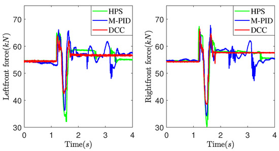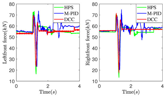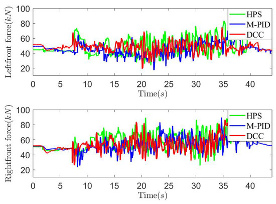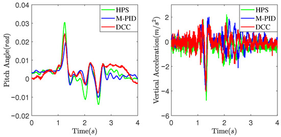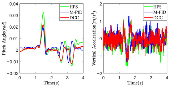 Figure 11 and Figure 12 present experimental data obtained at a vehicle speed of 7 km/h. Figure 11 illustrates the suspension actuators’ output force as the vehicle crosses a convex obstacle. It can be observed that the output force initially increases, then decreases, and eventually stabilizes. Comparatively, the DCC method exhibits smaller fluctuations in output force compared to the HPS and M-PID methods. As shown in Figure 12, the MPID method achieves a smaller peak pitch angle due to its direct control of the vehicle’s attitude. However, the DCC method demonstrates a smaller peak vertical acceleration value than the HPS and M-PID methods.