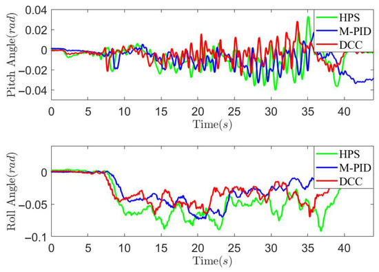 To verify the effectiveness of the proposed DCC method, comparative experiments were conducted using the HPS and the multi-objective PID (M-PID) method as benchmarks. The M-PID method, as referenced in [35], employs traditional centralized attitude control strategies to minimize the vehicle’s pitch and roll angles. In this study, the M-PID method is a comparative benchmark to evaluate the proposed DCC method against traditional centralized attitude control approaches. The parameters of the M-PID controller are set to .