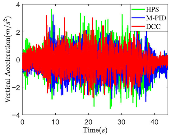 Figure 13 and Figure 14 illustrate the experimental data obtained at a vehicle speed of 10 km/h. It can be observed from Figure 13 that as the vehicle speed increases, the DCC exhibits smaller fluctuation peaks and amplitudes in the output force when compared to the HPS. Additionally, it shows a smaller deviation from the expected static output force. Figure 14 depicts the experimental comparison curves of the pitch angle and vertical acceleration of the vehicle body at a speed of 10 km/h. As observed in Figure 14, the DCC demonstrates superior performance over the HPS and M-PID, resulting in smaller fluctuation peaks and amplitudes in vertical acceleration of the vehicle body.