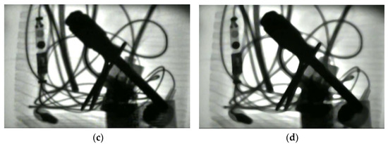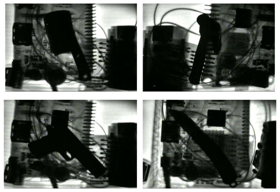 Image blurring is the operation of blurring the X-ray images by Gaussian blur, averaging blur and median blur techniques. In most cases, the images of prohibited items produced in the laboratory are good quality and do not show blurring. However, in the real detection scenarios, due to the movement of the conveyor belt or other external vibrations, X-ray images may be blurred. By applying image blurring techniques, it is possible to simulate real detection scenarios. In this study, the standard deviation used for Gaussian blurring ranges from 0 to 3, and the larger the value, the greater the intensity of the blurring effects accomplished. The size of the averaging blurring filter window is set to 2–7, and the larger the filter window, the stronger the blurring effect accomplished. The median blurring filter window is set to 3–11, and the filtering effect increases as the filter window size increases. The blurred effects of the X-ray images of the prohibited item are shown in Figure 6.