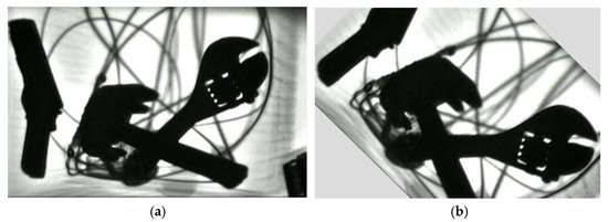 Affine transformation of prohibited items X-ray image. (a) The original captured X-ray image; (b) the affine transformation of (a).