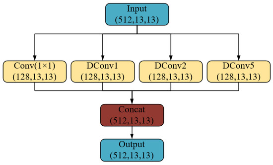 Meanwhile, this study adds a Dilated Convolution Spatial Pyramid module (DCSP) after the feature layer of the backbone network, to extract multi-scale features of prohibited items. The dilated convolution, compared to the traditional convolution, incorporates the expansion rate as an additional parameter. Adjusting the expansion rate leads to the acquisition of a larger receptive field with the same number of parameters. In the dilated convolution spatial pyramid module, 1 × 1 convolutions and 3 × 3 convolutions with three dilation rates of 1, 2, and 5 are used to obtain different scales of receptive fields, as shown in Figure 9. Therefore, there are four types of receptive fields, namely the 1 × 1 receptive field obtained from the 1 × 1 convolution, as well as the 3 × 3, 5 × 5, and 11 × 11 receptive fields obtained by combining the 3 × 3 convolution with different dilation rates. To reduce the computational cost of the algorithm, the number of output feature-map channels by each convolution operation is reduced to 1/4 of the number of the input feature-map channels. Finally, the four output feature maps are stacked together along the channel dimension, so that the feature-map channels after passing through the DCSP are consistent with the number of channels before this module.
