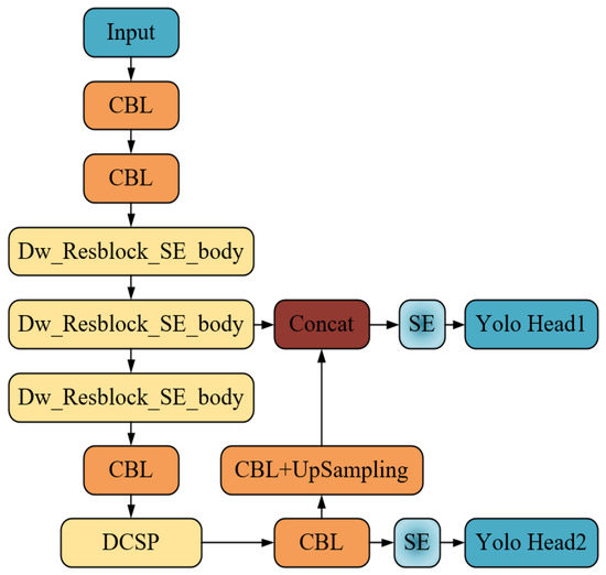 The overall framework of the improved model in this study named DW-SE-DCSP-YOLO, is shown in Figure 10. The CBL represents the combination of the convolution, batch normalization and LeakyReLU activation function.