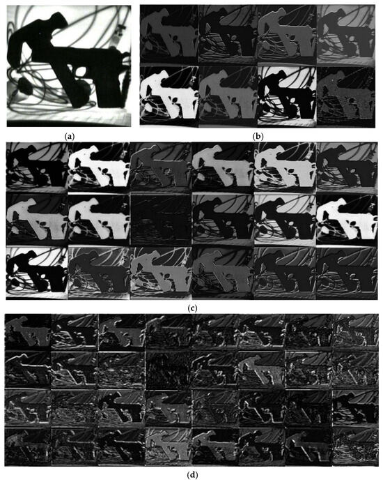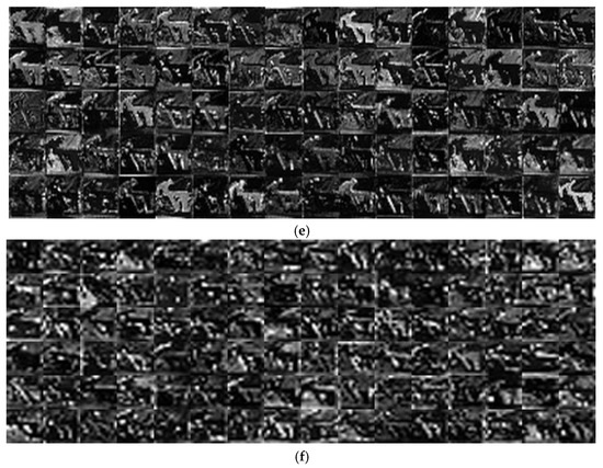 By obtaining the feature maps of typical prohibited items during the model processing, the extraction ability of the model established in this study for the characteristics of prohibited items can be demonstrated and visualized, shown in Figure 11. Figure 11a shows the X-ray images of a hammer and a pistol. Figure 11b presents the visualization of the feature map after the first convolution operation of Figure 11a. Figure 11c shows the visualization of the feature map after the second convolution operation of Figure 11a. Figure 11d–f represent the visualization of the feature map after the operations of the first, second, and third residual modules of Figure 11a, respectively. Due to the fact that the original X-ray images contain relatively little detailed texture information, the outline information of the prohibited items is more prominently displayed in the visualized feature map. After multiple convolutions, the information of the prohibited item’s feature map gradually transforms from clear contour information to its essential feature data.
