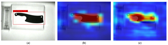 The heat map of the prohibited items during the detection by the proposed Dw-SE-DCSP-YOLO in this study is shown in Figure 12. It is shown that the prohibited items were successfully detected in Figure 12a. Figure 12b shows the heat map of the feature map with a scale of 13 × 13. The darker the red color, the greater weight of the feature extracted from that area. Figure 12c shows the heat map extracted from a feature map with a scale of 26 × 26. Considering the color of the feature, the detected target’s weight is lower compared to that in Figure 12b, indicating the difference in the weights of feature values for the same target under different scales.