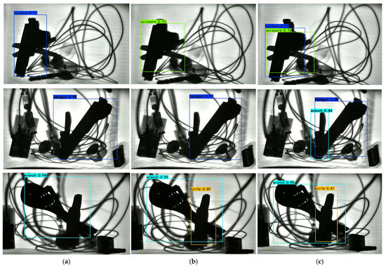 Comparison of recognitions of each prohibited items recognition algorithm. (a) The detection effect of YOLO v3-tiny; (b) the detection effect of YOLO v4-tiny; (c) the detection effect of our proposed model.
