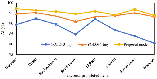 To verify the effectiveness of the proposed Dw-SE-DCSP-YOLO algorithm, a comparative experiment was conducted with YOLOv3-tiny and YOLOv4-tiny, shown in Figure 13. The detection AP of each algorithm is shown in Table 2. Comparison of experimental results of various detection algorithms for prohibited items. In Figure 14, the detection accuracies of these three algorithms for the 8 typical prohibited items all exceed 80%, and the detection AP of the Dw-SE-DCSP-YOLO algorithm are all higher than 93%, and its lowest value is for Wrench, with an AP of 93.86%, and its highest value is the Hammer, with an AP of 97.17%. Moreover, the detection AP of Dw-SE-DCSP-YOLO for all types of prohibited items are very even, indicating the capability of its detection of different types of prohibited items are nearly the same.