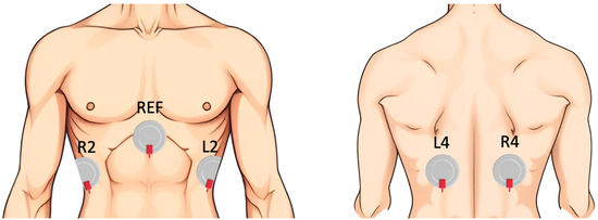For the dEMG signal, noise reduction was achieved using a fourth-order Butterworth filter with a band-pass range of 5 to 250 Hz [37], along with a 50 Hz notch filter to eliminate power-line interference. The bipolar configuration was obtained by subtracting signals from neighboring electrodes (L2–L4 as channel 1, L4–R4 as channel 2, and R2–R4 as channel 3), resulting in three channels. Significant interferences from the electrocardiogram signal and movement artifacts were mitigated using a recently developed SVD-based algorithm [38], which showed superior performance with respect to the state of the art [10].