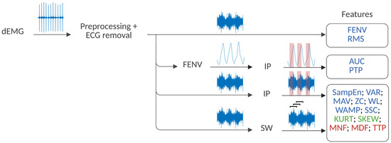Strategy for dEMG feature extraction. Time-domain features are highlighted in blue, statistical-domain features in green, and frequency-domain features in red. The SW and IP stand for the sliding window and the inhalation phase strategy, respectively.