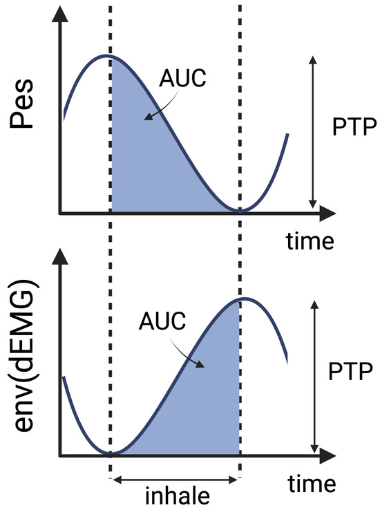 To capture amplitude characteristics, the AUC [14,15,21,23,25,44] and PTP values [16,17,27,34,44,45] were calculated during the inspiratory phase of the FENV signal. The start of expiration was identified by minimal pressure and peak electrical activity, following the Pes-based definitions of inspiratory phase boundaries according to the state-of-the-art methods reported in previous studies [13,16,17]. This allowed for the calculation of the AUC during inhalation and the estimation of PTP as the amplitude difference between exhalation and inhalation, as illustrated in Figure 3.
