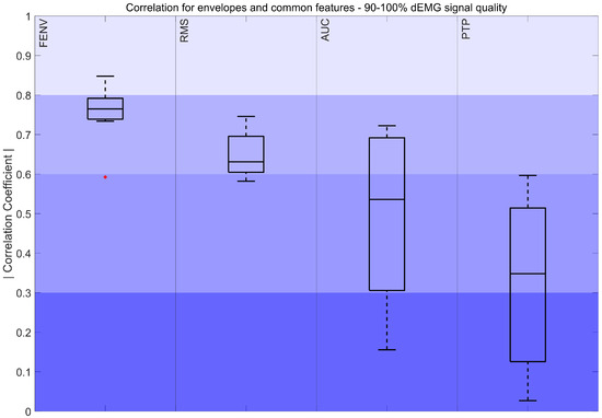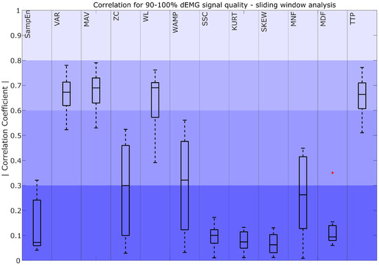 Correlation coefficient for 90–100% dEMG signal quality in the sliding window approach. The color intensity presents the strength of the correlation, ranging from poor (0–0.3) as the most saturated to fair (0.3–0.5), moderately strong (0.6–0.8), and very strong as the least saturated (0.8–1). The red plus signs indicate outliers.