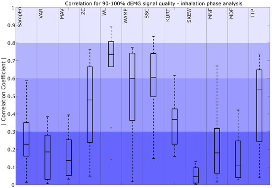 Correlation coefficient for 90–100% dEMG signal quality in the inhalation phase. The color intensity presents the strength of the correlation as poor (0–0.3) as the most saturated, fair (0.3–0.5), moderately strong (0.6–0.8), and very strong as the least saturated (0.8–1). The red plus signs indicate outliers.