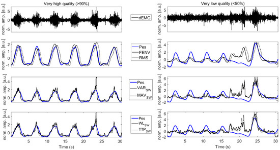 The standard dEMG features (FENV, RMS, AUC, and PTP), as well as features performing better at high signal quality (i.e., showing median correlation R > 0.5), were selected for further evaluation across different quality intervals. A representative example of VH and VL quality signals across selected features is presented in Figure 7.