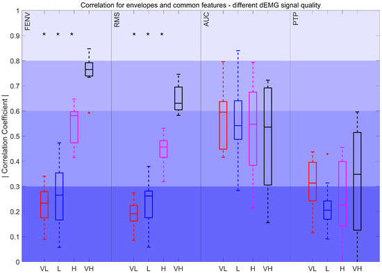 Correlation coefficient for FENV, RMS, AUC, and PTP for different intervals. Very low (VL): %, Low (L): , High (H): , and Very high (VH): . The red plus signs indicate outliers. *: p < 0.017