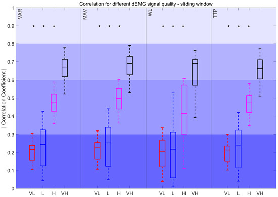 Correlation coefficient for different dEMG signal quality levels in the sliding window approach. Very low (VL): %, Low (L): , High (H): , and Very high (VH): . *: p < 0.017