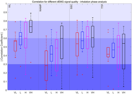 Correlation coefficient for different dEMG signal quality levels in the inhalation phase. Very low (VL): %, Low (L): , High (H): , and Very high (VH): . The red plus signs indicate outliers.