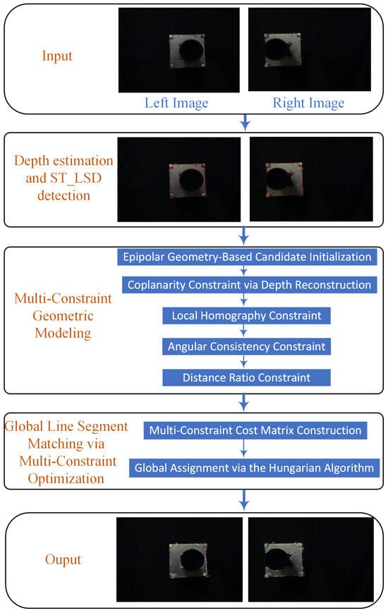 The remainder of this paper is organized as follows. Section 2 provides an overview of the proposed method. Section 3 introduces the depth estimation and ST_LSD detection. Section 4 presents the multi-constraint geometric modeling, covering epipolar geometry-based candidate initialization, coplanarity constraint via depth reconstruction, local homography constraint, angular consistency and distance-ratio constraint. Section 5 describes the global line segment matching via multi-constraint optimization. Section 6 reports the experimental results and discussion. Finally, Section 7 concludes the paper.